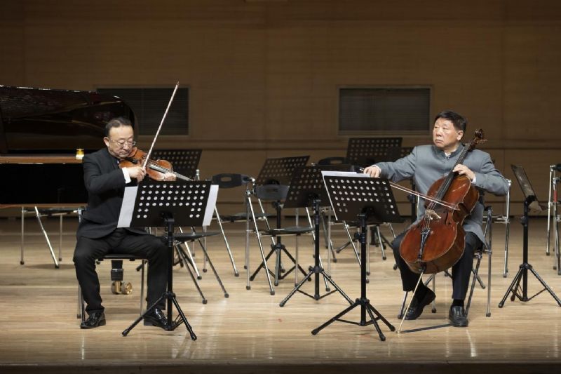 为深入开展学习贯彻习近平新时代中国特色社会主义思想主题教育,搭建文艺交流平台,提高人才培养质量,推进辽宁文艺事业繁荣发展,4月22日,“我和我的祖国”室内乐作品音乐会在我院音乐厅成功举办。十三届全国政协文化文史和学习委员会副主任、中国人民政协理论研究会副会长、满天星业余交响乐团团长叶小文,中央歌剧院院长、艺术总监、著名小提琴演奏家刘云志,中央歌剧院一级演奏员、大提琴首席杨娣携手我院室内乐团,共同演绎多部中外经典室内乐作品,为观众奉献了一场高品质的艺术盛宴。十三届全国政协经济委员会副主任、辽宁省人民政协理论研究会会长、省政协原主席夏德仁,省委宣传部副部长杨利景,我院领导班子成员和部分师生共同欣赏音乐会。