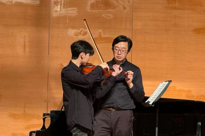 大师课上,李伟纲教授针对不同时期、不同风格的作品为学生们作了深入细致的分析和讲解。他指出,弓和弦之间要时刻处于摩擦状态,才能使声音保持一定密度与能量。针对技术训练中左右手“放松”这一难题,他强调,要拉出好听的声音,无论左手还是右手都需要放松,并亲自示范如何使其放松的方法。