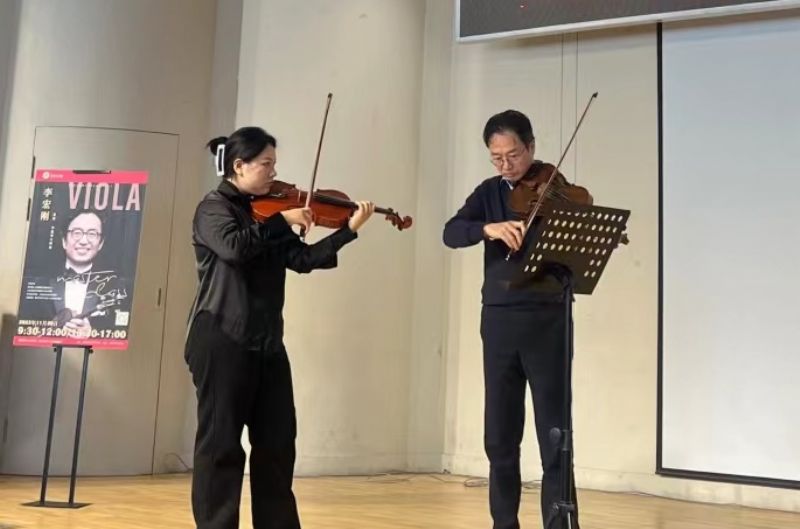 李宏刚教授系统讲解了中提琴演奏技术与弦乐四重奏演奏方法。他指出,音准练习要采用横向音准和纵向音准两种方式来练习,还要注意左手手型变化,在换弓换音时注意左右手交替进行。他强调,弦乐四重奏要严格按照谱面标记演奏,仔细研究声部之间的关系,对于声部之间的配合不仅仅是数拍子,还要结合和声色彩与乐句律动以达到理想的效果。