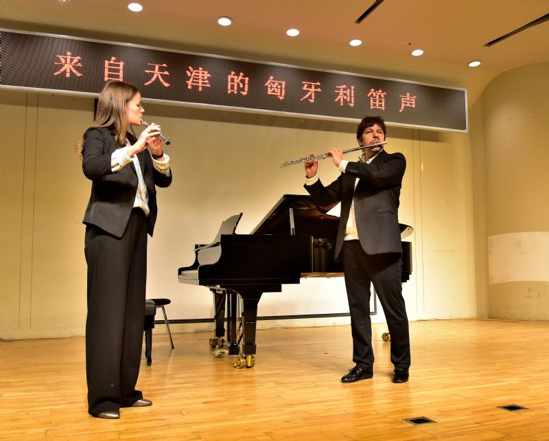 12日,“来自天津的匈牙利笛声”音乐会在我院第二教学楼多功能厅精彩上演。盖尔盖伊·伊采什、朵拉·阿比格尔·萨博与我院管弦系钢琴艺术指导教师张砯联袂为广大师生和音乐爱好者奉献了一场精彩的演出。音乐会上,伊采什夫妇为现场观众演奏了巴洛克风格的台莱曼幻想曲、法国近现代作曲家杜替耶的小奏鸣曲等9部不同风格的作品。