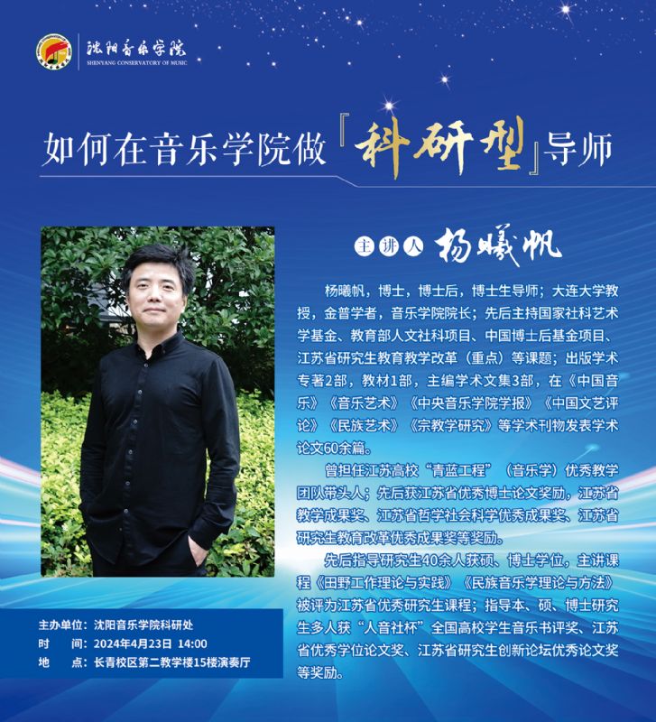 嘉宾简介:杨曦帆,博士,博士后,博士生导师;大连大学教授,金普学者,音乐学院院长;先后主持国家社科艺术学基金、教育部人文社科项目、中国博士后基金项目、江苏省研究生教育教学改革(重点)等课题;出版学术专著2部,教材1部,主编学术文集3部,在《中国音乐》《音乐艺术》《中央音乐学院学报》《中国文艺评论》《民族艺术》《宗教学研究》等学术刊物发表学术论文60余篇。