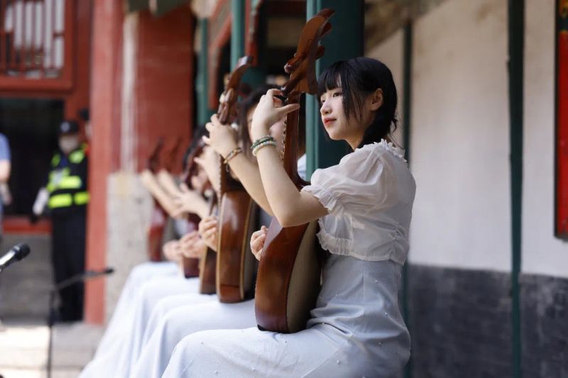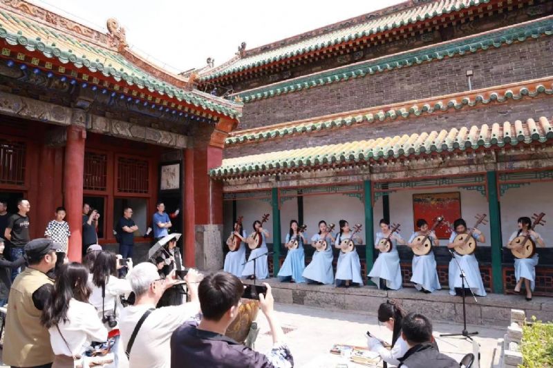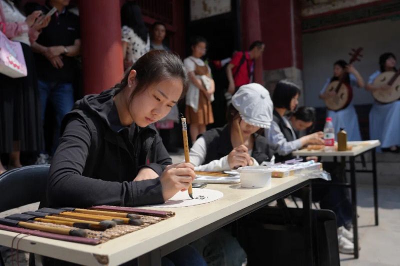 在保极宫,我院民族器乐系“梅朵”阮族乐团的同学们先后演奏了具有浓郁中国风色彩的《丝路驼铃》《龙马精神》等6首作品。在悠扬的乐曲声中,鲁美中国画学院的同学们现场挥毫泼墨,即兴展示国画艺术的魅力。弦歌雅韵与笔墨丹青的艺术合集,令现场游客赞叹不已。