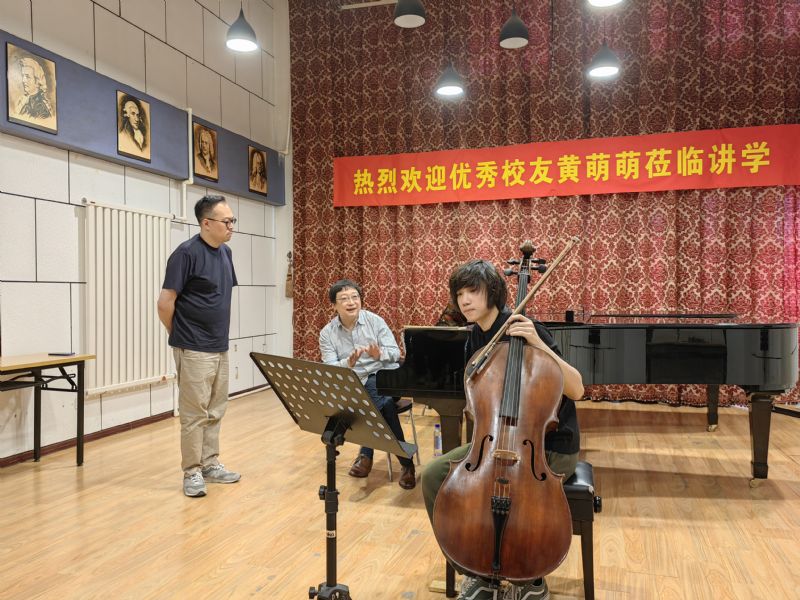黄萌萌表示,有机会再次回到母校格外亲切、倍感温暖。他回顾了在附属中等音乐学校求学的美好时光,对母校和师长们的教育培养表示衷心感谢。黄萌萌详细介绍了中央音乐学院艺术指导专业现状、毕业生就业方向等。他表示,虽然已经毕业几十年,但在专业教学和学术交流中始终与母校保持着密切联系。感谢母校一直以来对广大校友的关心关爱,对母校的眷恋始终珍藏在每一名校友心中。今后会积极推动中央音乐学院与母校的合作交流,创造更多机会回报母校。