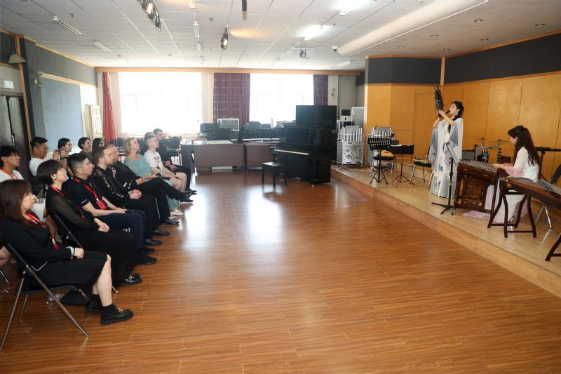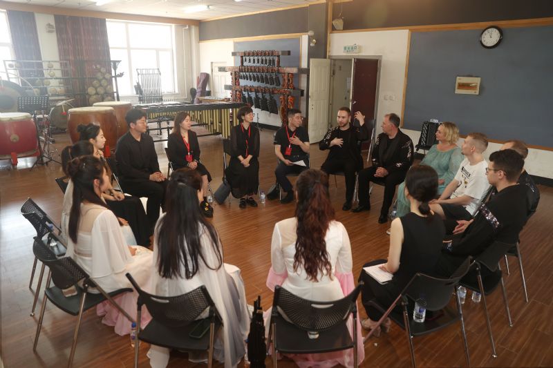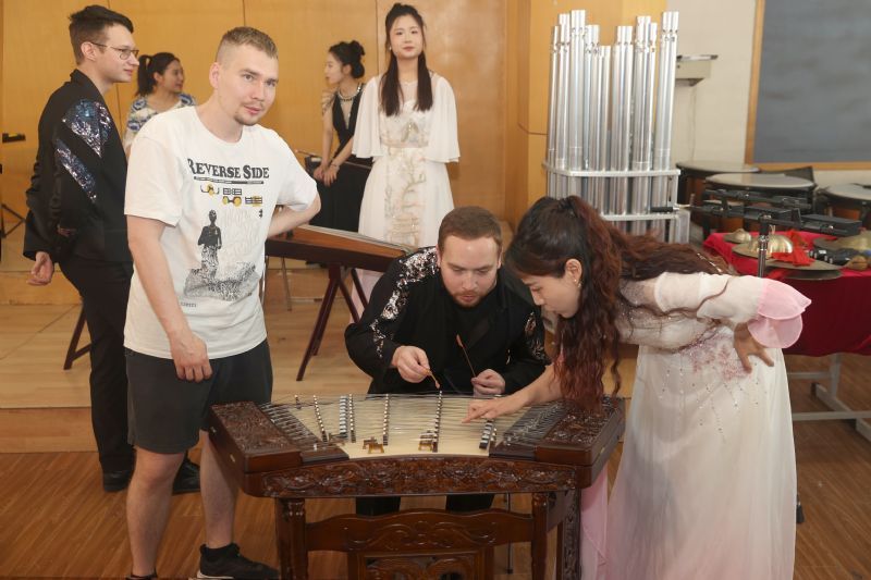 活动现场,“贝加尔湖四重奏”团队成员与民族器乐系师生进行了亲切友好交流。师生们为俄方艺术家现场讲解并示范演奏了扬琴、笙、古筝等中国民族乐器。