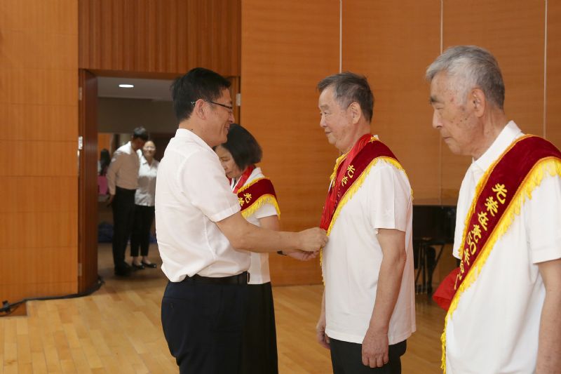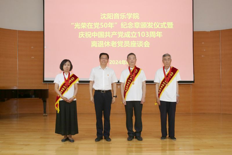 赵恒心为获得“光荣在党50年”纪念章的原音乐教育系主任陈秉义、原音乐教育系声乐教研室主任徐淑云、原艺术学院文化基础课程部副教授刘忠喜等3名同志颁发纪念章。