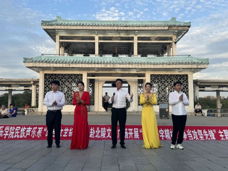 七一前夕,民族声乐系党总支组织“红色文艺轻骑兵”小分队师生走进沈阳北陵公园文化广场,开展“弘扬干字精神 争当攻坚先锋”主题党日活动。活动由学生党支部书记易美含主持。