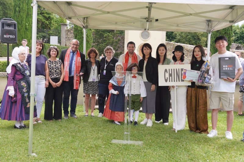 法国当地时间7月7日,我院代表团在罗芒市国际博物馆花园与罗芒市主管文化事务的副市长大卫·罗伯特(David Robert)、罗芒音乐节主席阿兰·尚佩(Alain Champey)会谈并交换礼物。当晚,代表团参加了罗芒站巡演最盛大的闭幕式演出,近千名观众观看演出。