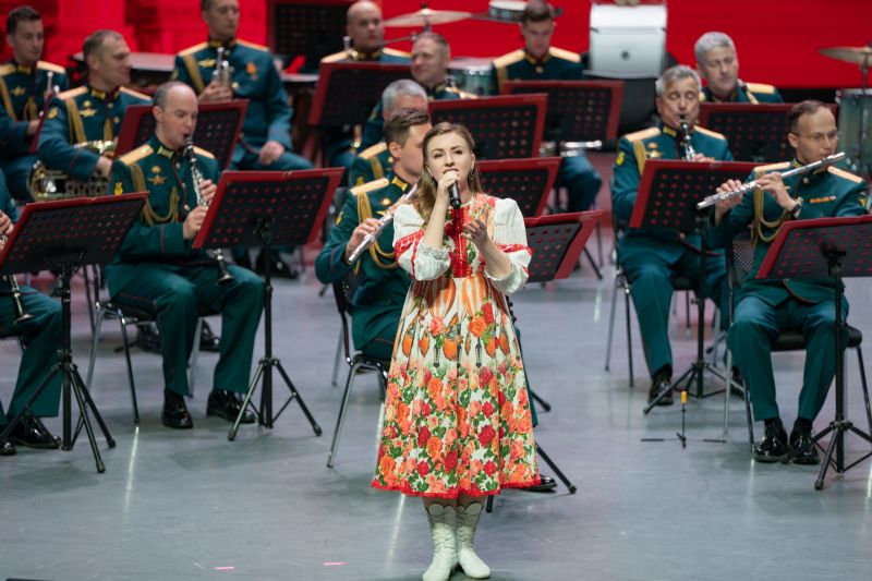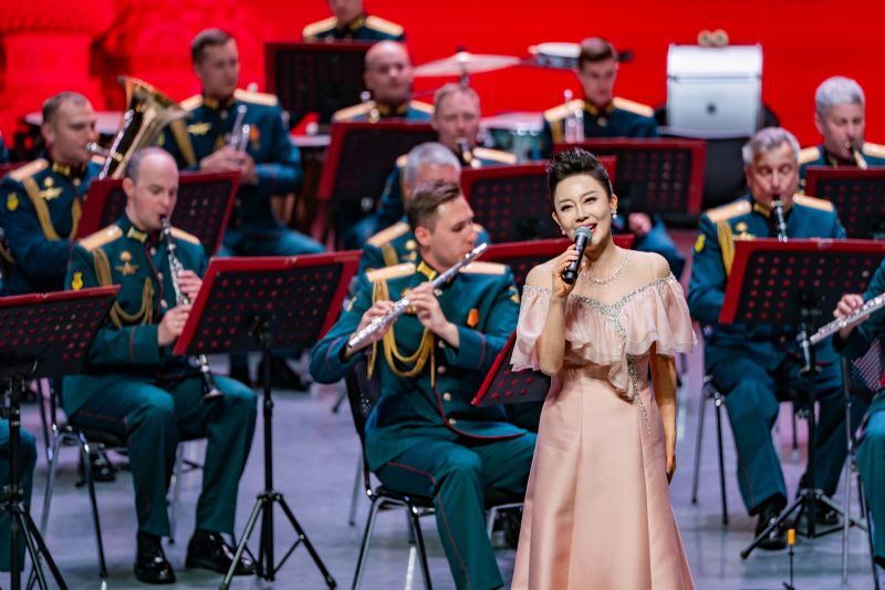 音乐会在俄罗斯功勋艺术家季莫费·马亚金少将指挥的柴可夫斯基《第四交响曲》终章的磅礴声浪中启幕。这部“命运抗争”的史诗,令观众仿佛置身硝烟弥漫的战场。歌曲《芦花》,演唱者以空灵的嗓音勾勒江南水韵,与俄罗斯民歌《毡靴》的“冬日幽默”形成诗意对话。维吾尔民歌《一杯美酒》热情奔放;巴拉莱卡琴奏响的《节日庆典》再现了斯拉夫民间婚礼的狂欢场景;歌曲《在希望的田野上》饱含对美好生活的赞美;歌曲《春天的芭蕾》《俄罗斯上空飞行》,演唱者以高超的演唱技巧引发观众赞叹;《五月华尔兹》经典的旋律将观众回到1945年那个鲜花漫天的胜利之春,《莫斯科郊外的晚上》《喀秋莎》熟悉的旋律则将全场气氛推向高潮,观众长时间起立鼓掌,致敬这场跨越80载的音乐对话。