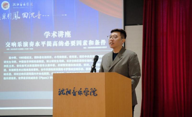 6月17日,我院1983级校友,国际著名指挥家、小号演奏家、教育家戴中晖教授应邀来院举办题为《交响乐演奏水平提高的必要因素和条件》的专题讲座及大师课。本次讲座是我院“筑巢引凤回沈音”系列活动的第九场主题活动。学院副院长庞渤出席,管弦系、教务处、对外合作办公室负责人及管弦系拔尖人才师生代表等百余人参加讲座和大师课。