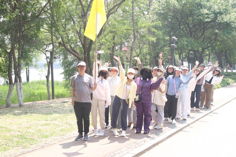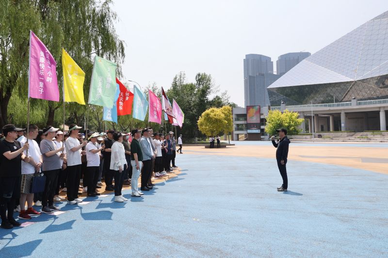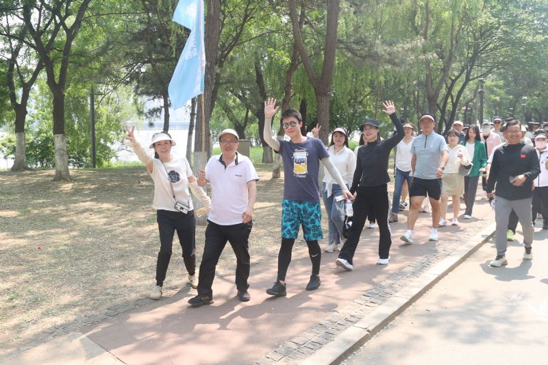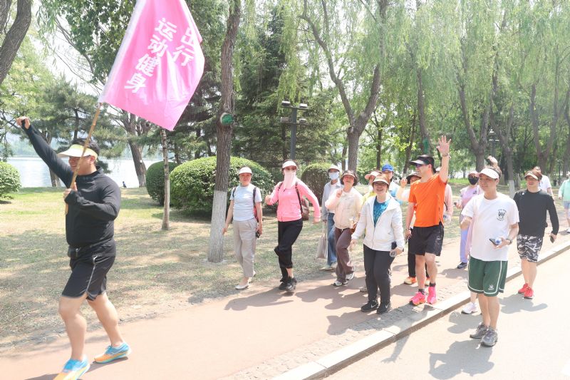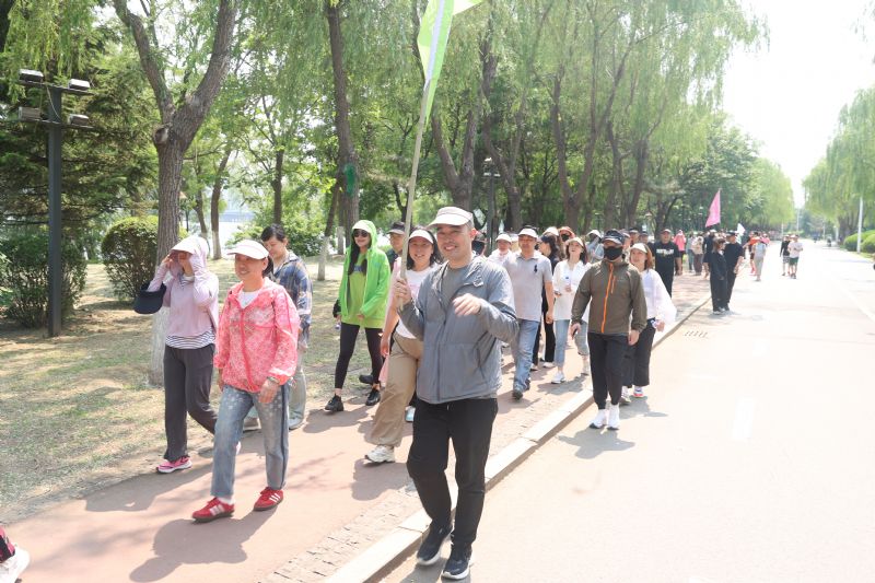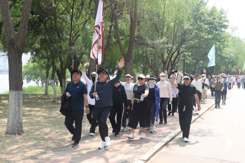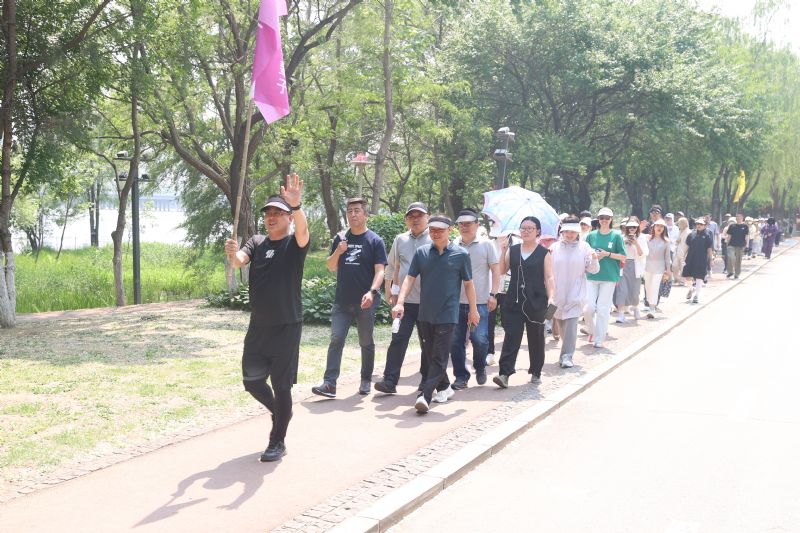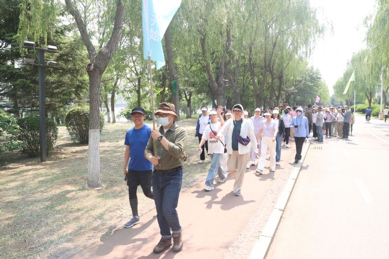 随后,十个精神抖擞的健步走方队高举队旗,从“沈阳浑河”广场有序出发,沿滨水路健身步道一路东行,抵达富民桥下折返。绵延数里的林荫步道,成为沈音教职工矫健身姿与欢声笑语的流动背景板。旗帜在风中飘扬,与浑河之畔的盎然绿意相映成趣,构成一幅充满活力与和谐的文化图景。