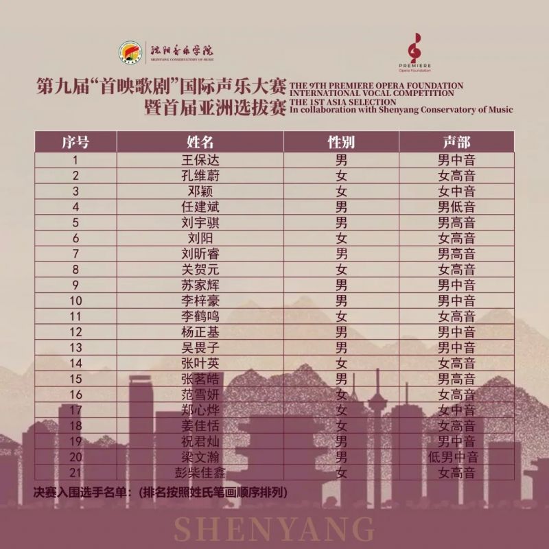 第九届“首映歌剧”国际声乐大赛暨首届亚洲选拔赛入围决赛选手名单